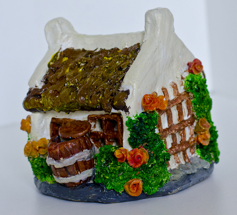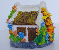 | Hand-painted, Stoneware-fired thatched cottage with autumn leaves, bluebells and roses | Hand-painted, Stoneware thatched cottage with trellis, climbing roses and lilies | Hand-painted, Stoneware thatched cottage with trellis and climbing roses | Hand-painted, Stoneware thatched cottage with peeling brickwork, climbing roses and lilies |